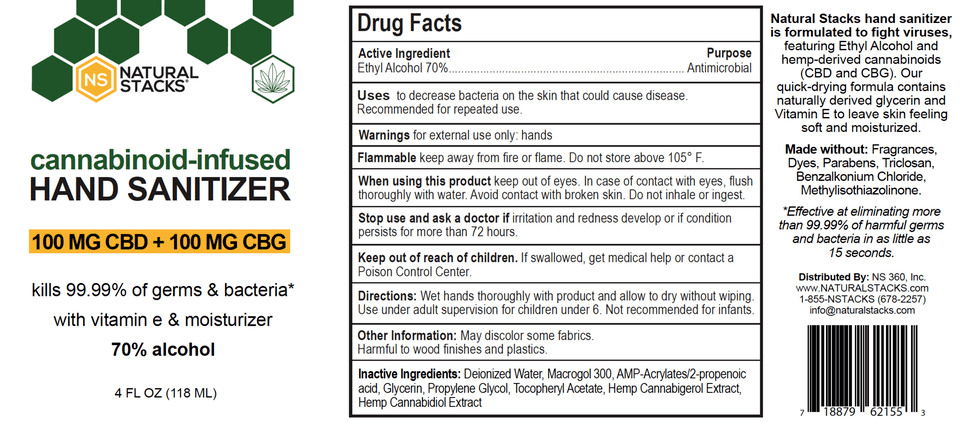 Natural Stacks hand sanitizer is formulated to fight viruses, featuring Ethyl Alcohol and hemp-derived cannabinoids (CBD and CBG). Our quick-drying formula contains naturally derived glycerin and Vitamin E to leave your skin feeling soft and moisturized.